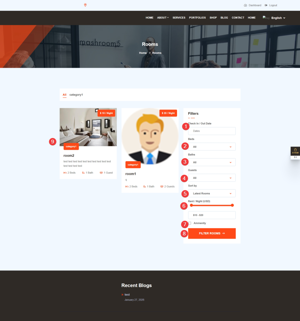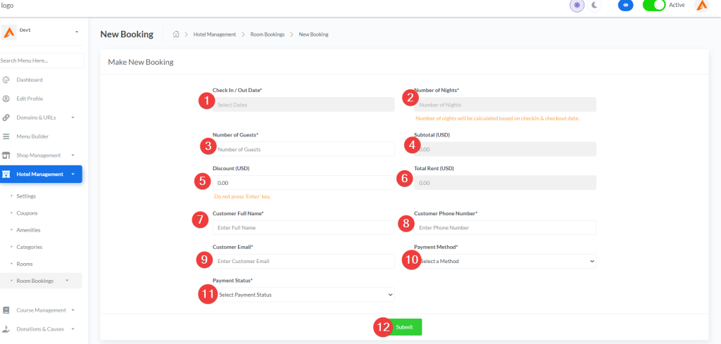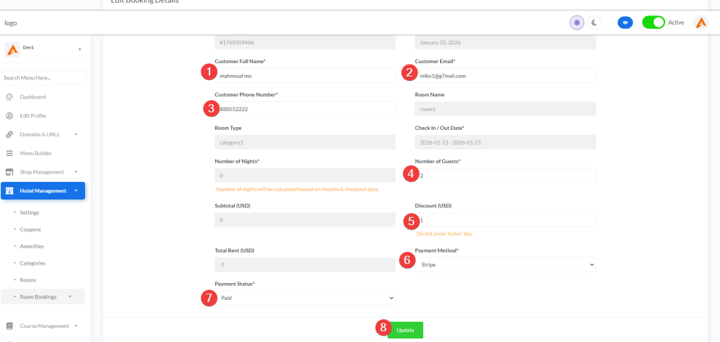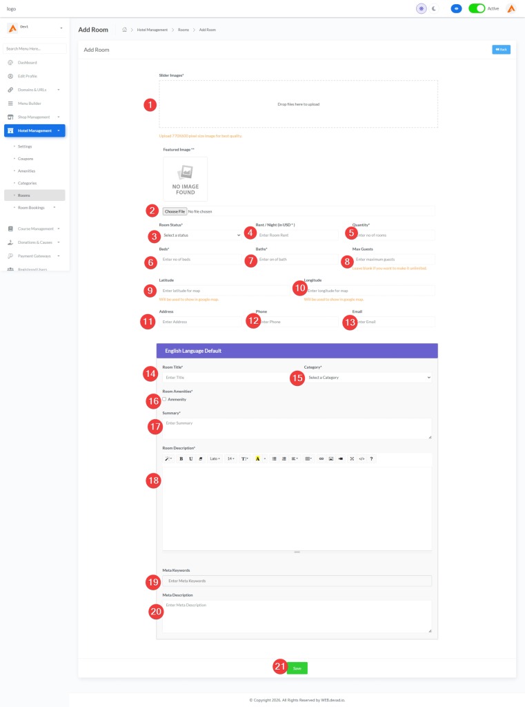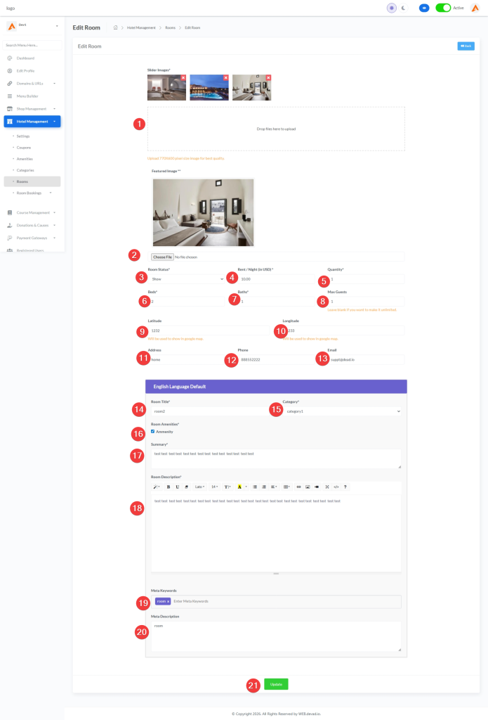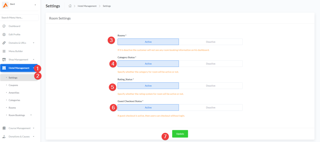 | Rooms | Active / Deactive | Enables/disables the entire room booking system | When deactive, customers won’t see any room booking information on their dashboard |