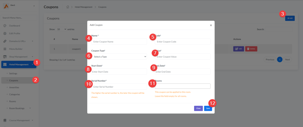 Access: Hotel Management → Coupons → Add (top-right button)
