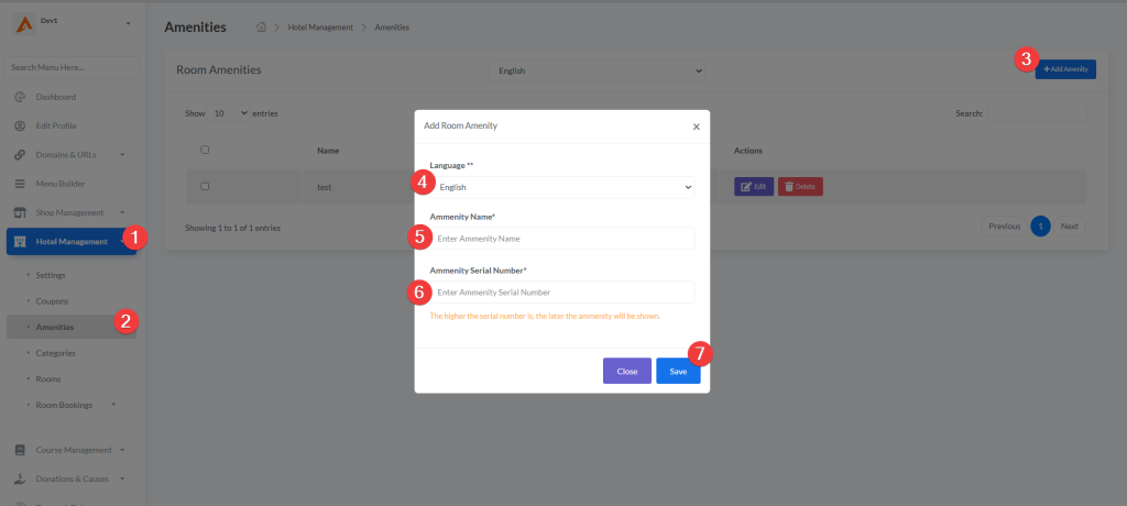 Access: Hotel Management → Amenities → Add Amenity
