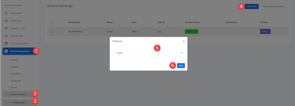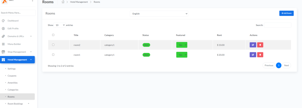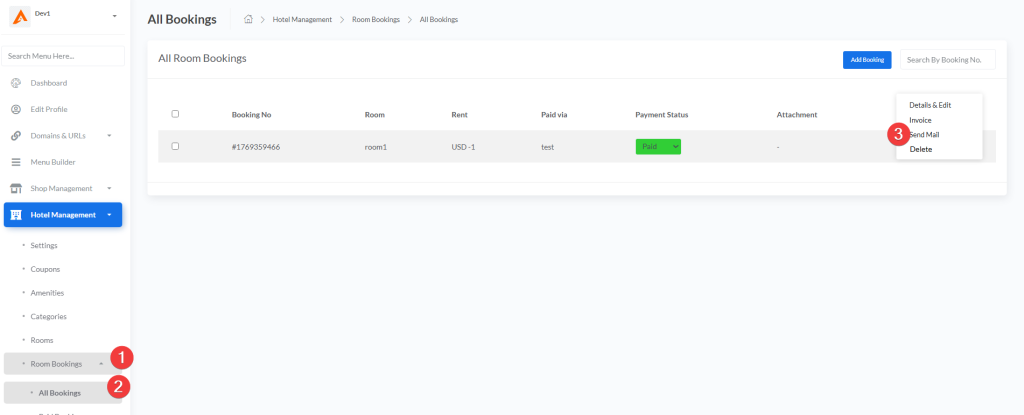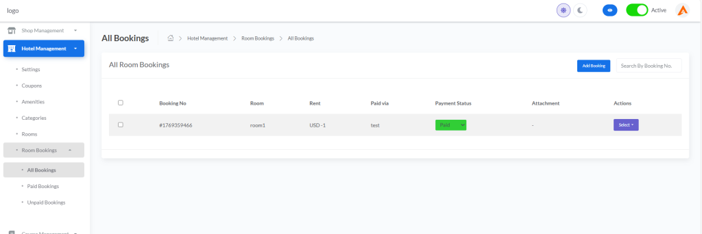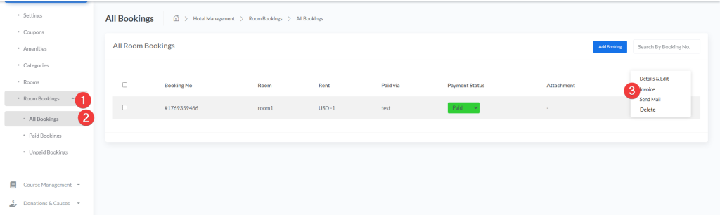 - Room Bookings – Booking management (All, Paid, Unpaid)